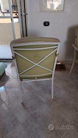 Sei poltrone in alluminio bianco e un tavolo da 12 in alluminio bianco MANCANTE DI VETRO SOPRA. Le condizioni di tenuta sono buone, manca il vetro sul tavolo