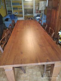 tavolo in massello di rovere rustico con qualche crepo e spaccatura che poi verrà stuccato con stucco nero levigato e spazzolato, con misura lunghezza 300 larghezza 100 altezza 80 con 4 gambe in pezzo unico che andranno rastremate a punta con goletta, top con spessore 4 cm, Il tavolo verrà fatto fisso con cui la gamba posta + interno rispetto al top (in stile) con relative fasce laterali di sostegno (telaio) abbassamento di circa 10 cm che unirà le 4 gambe e il tutto verrà fissato sotto al piano con idonea ferramenta. Il TUTTO SARA' IN MASSELLO E UNITE TRA LORO CON ANIMA INTERNA E VARI TAGLI PARTE SOTTO NASCOSTA. Lucidatura tinta noce medio. Tavolino porta affettatrice in massello di rovere rustico con misure lunghezza 80 prof. 45 h 90 predisposto con 4 gambe dritte (rastremate solo nella parte sotto al ripiano fisso) con top superiore 3 cm mentre inferiore spessore 2 cm che servirà per dare stabilità al tutto con gambe da 8 x 8 circa. Spazzolato e stuccato nero opaco con finitura lucidata tinta noce chiaro. costruito su commissione ed esigenze del cliente, non è disponibile a magazzino ma essendo i diretti produttori falegnami possiamo riprodurlo uguale o in base alle proprie esigenze. per domande o dubbi contattateci P.S. disponibili a dare suggerimenti o chiarimenti in merito, per noi conta dare vita al vostro sogno DIRETTAMENTE DAL PRODUTTORE ASTENERSI RIVENDITORI O COMMERCIANTI