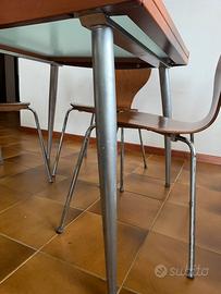 Tavolo con 4 sedie. La mosura del ravolo raddoppia aprendolo. Qualche segno di usura sulle gambe che sarebbero eventualmente da dipingere.