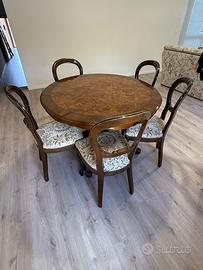 Vendo tavolo rotondo color noce in legno massello allungabile con 6 sedie abbinate , leggeri segni di utilizzo ma perfettamente integro e sano, no tarli o altri problemi simili.