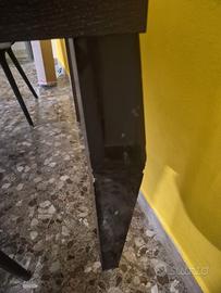 tavolo nero/marrone 180x106 fisso con 4 sedie plastica dura con braccioli (IKEA acquistate a 160 euro), le gambe sono in alcuni punti raschiate, ma e' anche vero che si possono girare dalla parte a squadro in cui non sono presenti raschi. Inoltre regalo tavolino basso con contenitore e rialzo Bar da ripristinare in alcuni angoli. Tavolo e tavolino acquistati da Natuzzi.