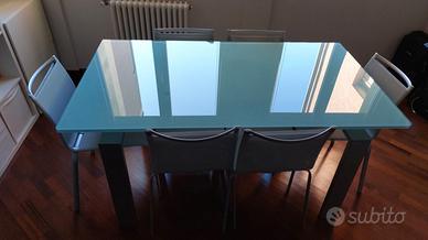 Splendido tavolo Calligaris 160*90, allungabile ,completo di 6 sedie. Dal design intramontabile , con il suo ripiano in vetro azzurro è il tavolo ideale per rendere la zona pranzo moderna e al tempo stesso sofisticata. Disponibile da fine marzo. Il prezzo,poco trattabile, è comprensivo delle 6 sedie.