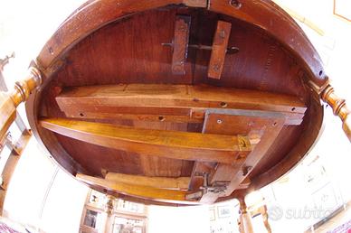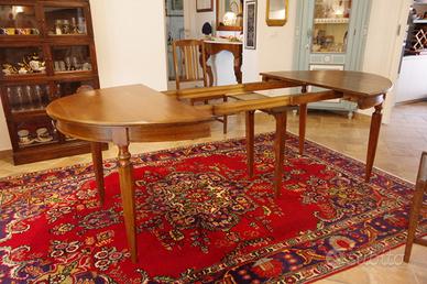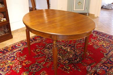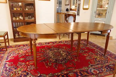 Tavolo ovale d'epoca, fine '800 (presumibilmente 1880-1890) perfettamente e finemente restaurato. Allungabile con tre tavole di 33 cm. ciascuna. Misure minime (senza tavole di prolunga): cm. 105x125. Misure intermedie (con 1, 2 o 3 tavole): cm. 105x158 - 105x191 - 105x224. Altezza cm. 75 Quattro sedie coeve del tavolo anch'esse perfettamente e finemente restaurate. Dato il limite di sole sei foto non è stato possibile aggiungere le immagini dei particolari. Se interessati, posso inviare più immagini via whatsapp oppure via email.