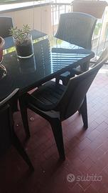 Set da giardino composto da tavolo, 150x90, oltre 6 sedie e 6 cuscini. Tutto in plastica colore verde inglese. Il tavolo ha il piano in vetro.