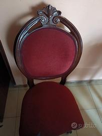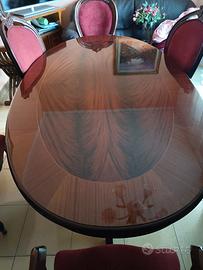 Tavolo ovale in piuma di mogano massello, largo cm 110 lungo cm 190, completo di sei sedie anche esse in mogano, di cui due sedie per capotavola con braccioli.