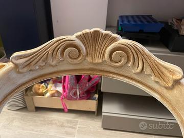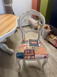 Tavolo e sedie in legno di noce restaurate con effetto chabby con stoffe di Montmarte.
