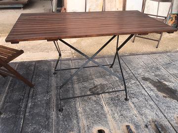 Vendo tavolo con 4 sedie , da esterno. Struttura in ferro con piano in legno color noce. 120 cm x 61 H= 71