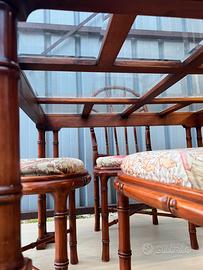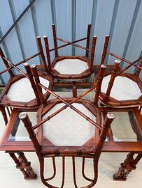 Set da pranzo design italiano anni ’70 Giorgetti – tavolo faux bamboo con piano in vetro e 4 sedie coordinate Il modello è riconducibile ai tavoli buffet attribuiti all’ambiente progettuale di Vittorio Gregotti, esempi di elegante equilibrio tra rigore architettonico e decorazione materica. Elegante set da pranzo italiano degli anni ’70 composto da tavolo quadrato e quattro sedie coordinate, realizzato in legno lavorato (faux bamboo), tipica cifra stilistica del design italiano del periodo 110 × 110 cm Altezza: 75 cm Dimensioni sedie Altezza seduta 45 cm altezza totale 100 cm Larghezza 50 cm Lotto composto da • 1 tavolo da pranzo • 4 sedie coordinate