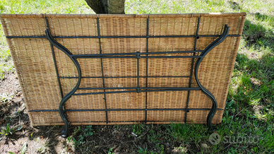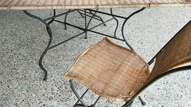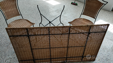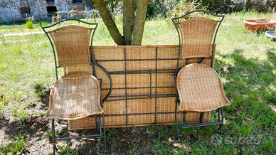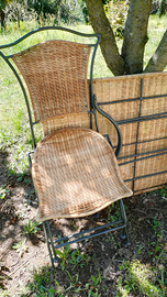 Tavolo smontabile 130 cm x 75 con struttura in ferro pieghevole, piano in ferro e midollino In alcune parti va revisionato il giunco, in quanto stando lì senza uso tende a staccarsi . Coppia di sedie pieghevoli da giardino, gazebo, tavernetta.