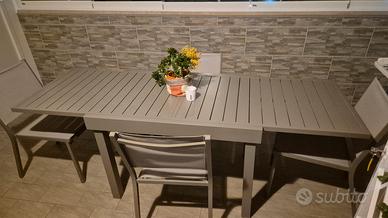 tavolo alluminio allungabile colore tortora 75x106/212 con 4 sedie stesso colore. Piende tavolo regolabile. Tutto in ottime condizioni come da foto.