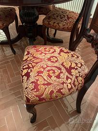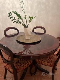 Tavolo in legno di mogano di diametro 120cm allungabile con 4 sedie rivestite in seta di San Leucio. Ritiro a carico dell’acquirente
