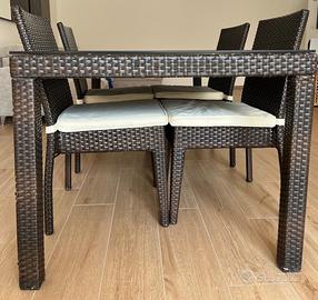 Tavolo con piano in vetro temperato 180x90 con quattro sedie complete di cuscini in polyrattan. No spedizione/ritiro in loco.