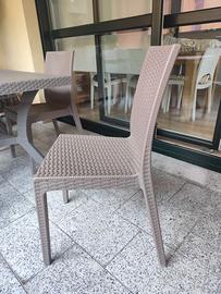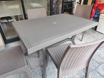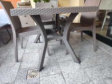 Tavolo e 4 sedie in rattan colore tortora. Dimensione tavolo: 76x106 h72