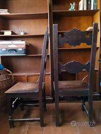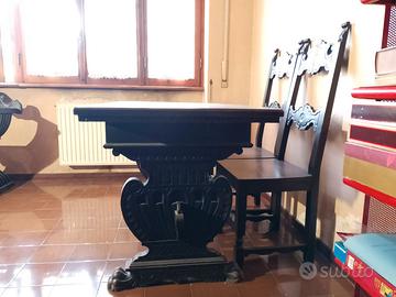 Vendo elegante set antico composto da tavolo "a fratina" e 2 sedie in legno massello scuro. Il tavolo è finemente lavorato con gambe a zampa di leone e una bellissima traversa centrale intagliata. Le sedie richiamano i motivi del tavolo con schienali artistici e traforati.