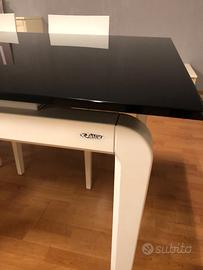Tavolo e quattro sedie marca Le Fablier d'esposizione, mai usato, solo esposto. Fanno parte della linea Mosaico che non è più in produzione. Sono in vero legno finitura bianco antico e tutti gli articoli sono marchiati a fuoco come da foto allegate. Il tavolo misura 160x90 da chiuso e 200x90 aperto h.78 . Il piano è in cristallo nero spessore 15 mm. mentre l'allunga che è riposta all'interno è in legno sempre in finitura bianco antico come si può vedere dalla seconda foto. Le sedie sono sempre in legno con rivestimento della seduta in vero cuoio nero. Non spedisco.