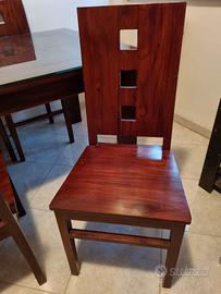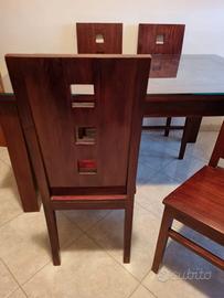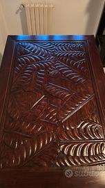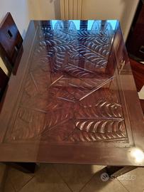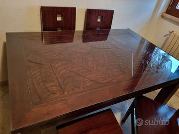 Vendo Tavolo intarsiato e 4 Sedie in legno Massello, provenienza Indonesia, ottimo stato. Superficie d'appoggio del tavolo intarsiata con motivo foglia di palma grande. Fattura artigianale, lavorazione manuale. Misure Tavolo in cm: 150x100x78, gambe smontabili per trasporto agevole. Cristallo misure in cm: 150x100x0,5 appoggiato sulla superficie superiore per proteggere l'intarsio. 4 sedie con seduta comoda, stesso legno massello del tavolo.