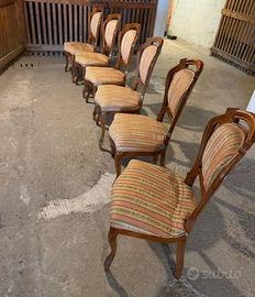 Vendo elegante tavolo ovale in legno massello, finitura lucida, color noce, con base centrale lavorata, stole classico perfetto per sala da pranzo o soggiorno, completo di 6 sedie coordinate con seduta e schienale imbottiti rivestiti in tessuto a righe.