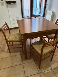 Tavolo quadrato con 4 sedie abbinate ed impagliate in buono stato di conservazione, il tavolo ha qualche segno sul pianale