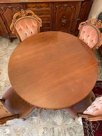 Prezioso tavolo da pranzo in legno, diametro 115 cm estensibile, con piedi intagliati a mano, anni 70, corredato da 4 sedie poltrone rivestite in velluto, arredamento classico di stile importante.