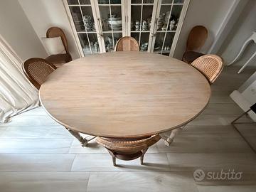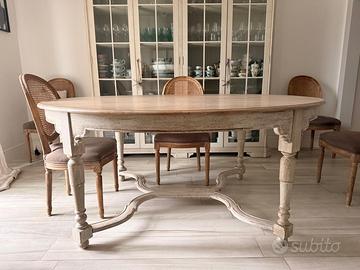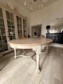 Tavolo ovale in legno di rovere con finitura color legno sul piano e bianco decapato nella parte inferiore.