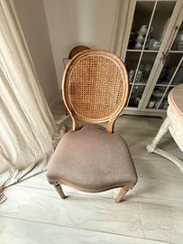 Numero 6 sedie imbottite in tessuto di cotone colore cacao e schienale in intreccio "paglia di Vienna". Gambe in legno di rovere intarsiato.