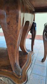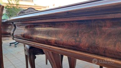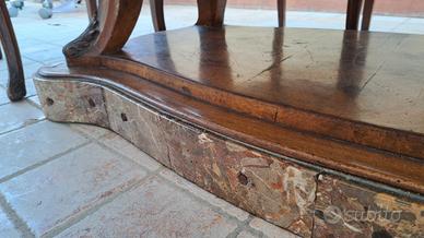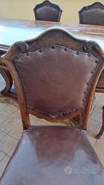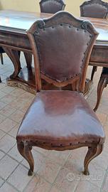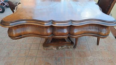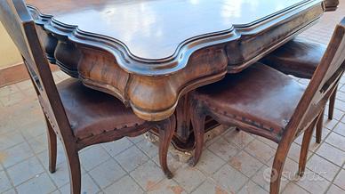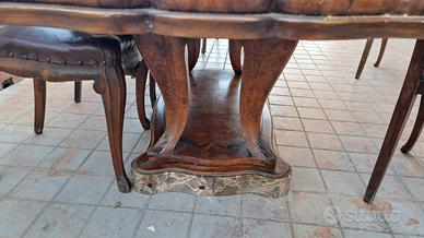 tavolo completo di 6 sedie 1930/50 in noce e radica la base ha un bordo in marmo che rifinisce la parte bassa . Inoltre il tavolo ha 2 grandi cassetti sui quali si possono realizzare prolunghe e far aumentare la lunghezza del tavolo. Misura 200x100 altezza piano 83 spazio utile per le gambe 63...M&P Antichità siamo un negozio specializzato in antiquariato vintage e shabby vendita al dettaglio e all ingrosso scarichi settimanali oltre 500 articoli in negozio, abbiamo una vasta scelta di como comodini tolette armadi letti vetrine vetrinette credenze servanti angoliere librerie tavoli tavolinetti sedie poltrone poltroncine divani lampade lampadari tappeti scrivanie scrittoi secretere ribaltine consolle quadri cornici specchi cassapanche bauli oggettistica varia idee regalo e molto altro ci troviamo a Roma zona Castelverde via Massa San giuliano 26b POSSIBILITÀ DI CONSEGNA E SPEDIZIONE IN TUTTA ITALIA