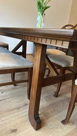 Tavolo sei posti con sedie, marca LE FABLIER, in legno noce e in buone condizioni. Sedie foderate e ricondizionate completamente