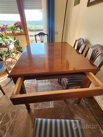tavolo in mogano primi 900 restaurato misure cm 130 x 100 + due prolunghe da cm 60 e 6 sedie in mogano anni 70 con sedute ricoperte in tessuto da tappezziere recentemente.
