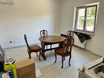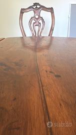 Set Sala da Pranzo d'Epoca: Tavolo a Libro e 4 Sedie Intagliate in Legno Massello Descrizione del Set Il Tavolo Splendido tavolo fratino in legno massello dalle tonalità calde e profonde. • Caratteristiche: Modello "a libro" (allungabile o apribile) con una robusta base a cavalletto unita da una traversa centrale. • Stile: Classico/Rustico, ideale per donare carattere a una cucina moderna o completare un ambiente tradizionale. • Stato: Ben conservato, con la naturale patina del tempo che ne esalta l'autenticità. Le Sedie (4 pezzi) Set di 4 sedie coordinate, finemente lavorate. • Design: Schienale alto con splendidi intagli a traforo (motivi a ricciolo/barocchi) che donano leggerezza alla struttura. • Comfort: Seduta imbottita e rivestita in ecopelle (o cuoio) color testa di moro, facile da pulire e resistente.