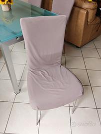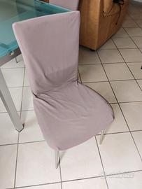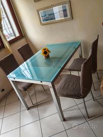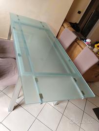 Tavolo in cristallo allungabile mis. 130 cm x 80 cm. Allungato da una sola parte raggiunge 160 cm altrimenti 190 cm totali. L'allungamento ha un sistema semplice ed immediato senza fatica con barre scorrimento e bloccaggio. Il materiale è vetro ed alluminio. Credo sia brand Calligaris. Vendo con nr. 4 sedie in buono stato come da foto con copertine color tortora. Solo tavolo 390 €. Tavolo con sedie 490€. Solo sedie 149 € tutte e quattro.