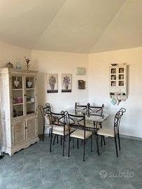 Tavolo con piano in vetro e base in ferro battuto come nuovo. Misure 80 x 150 sei sedie in ferro battuto con seduta imbottita colore beige (località Costa Paradiso ritiro a carico dell'acquirente)