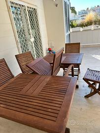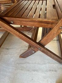 Vendo tavolo allungabile (160-220cm) e 6 sedie pieghevoli in teak (2 con braccioli) perfetto per terrazzi e giardini. Il tavolo è in buone condizioni, ottime con un minimo di manutenzione (carteggio e prodotto lucidante). Una delle sedie presenta una riparazione come mostrato in foto.