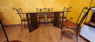Tavolo in cristallo 1,80 x 90 basamento in legno e 6 sedie in ferro battuto piene con seduta in legno... Vendo anche separatamente ! ,,,,,,Non spedisco.....