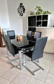 Tavolo in vetro temperato nero, allungabile, in perfette condizioni. In omaggio 8 sedie abbinate in ecopelle, usate ma in buono stato. Misure tavolo: Lunghezza: 150 cm (allungabile a 220cm) Larghezza: 90cm