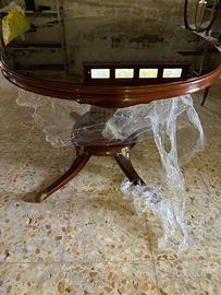 Vendo elegante tavolo rotondo in stile classico con piano in vetro temperato fumé, struttura in legno massello finemente lavorato e dettagli in ottone dorato alle estremità delle gambe.