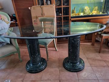TAVOLO ELLITTICO IN CRISTALLO CON COLONNE IN MARMO
