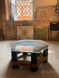 Artigianato artistico di ottima qualità. Tavolo esagonale con piano in resina, struttura in legno e piano di vetro sagomato. Misure: 90 cm x 90 cm - altezza 34 cm