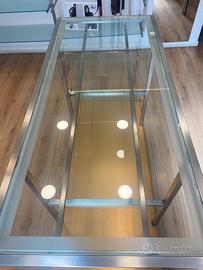 Tavolo espositore acciaio satinato con base in legno e ruote. Vendo come nuovo. Visibile a Catania. Lungo 1,65m altezza 1,00m largo 0,75 cm