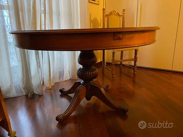 Tavolo estensibile con base e piano smontabili in legno massello. Completo di 6 sedie. Diametro tavolo 122 cm, Dimensioni tavolo esteso 122x182 cm.