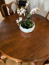 Vendo tavolo in solido legno con prolunga interna,circonferenza 120 cm e prolunga 30 cm.Abbinate 6 sedie con seduta e schienale in pelle.Possibilità di abbinare credenza presente in altro annuncio.