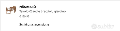 Tavolo Esterno 2 sedie esterno LEGNO NÄMMARÖ IKEA Utilizzato poco per 6 mesi ma lasciato fuori in terrazzo si sono un po' rovinate; causa vendita: Trasloco per vendita immobile. Guarda le altre inserzioni trovi altri arredi per la casa: Divano 3 posti, Letto matrimoniale contenitore e materasso, scrivania Librerie mobile da solotto moderno Ikea, armadio, e Armadio Cabina armadio Ikea completo di accessori, tavolino e sedie da Esterno. RITIRO A DOMICILIO A CARICO DELL'ACQUIRENTE, NON SPEDISCO LUOGO DI RITIRO: ROMA: ZONA SANGIOVANNI RE DI ROMA SCONTO QUANTITA' PER CHI VIENE E RITIRA TUTTO
