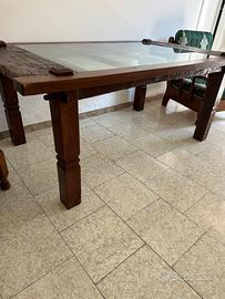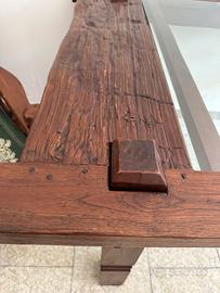Tavolo acquistato durante permanenza corea del sud . 2,05x1,10 mt molto grande con vetro temperato centrale (possibile serigrafia stemma famiglia) . Il tavolo è stato completamente restaurato. Non presenta ne chiodi nr viti, tutto assemblato con fermi in legno a contrasto. Unico nel suo genere. Prezzo di realizzo per cambio arredamebto casa
