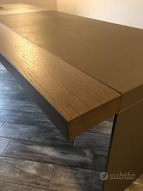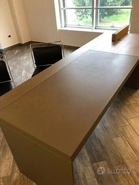Nella parte superiore del piano alcune fughe delimitano una lavorazione a doghe longitudinali. Il sottomano, realizzato con un pannello in MDF, è sempre rivestito in Cuoio Saddle color Tortora. La gamba è in metallo rivestito in cuoio abbinato al sottomano e ai frontali della cassettiera.
