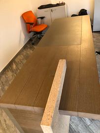 Le scrivanie H_O hanno il piano di forte spessore. Il piano delle scrivanie è realizzato con una tecnica “sandwich” con anima in multistrato di pioppo ed esterno in MDF e impiallacciato in Rovere Tortora con tranciati di elevato spessore.