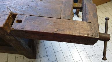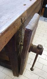 Antico tavolo da falegname con due morse funzionanti (una frontale e una a destra).