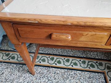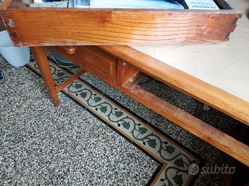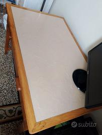 Tavolo in legno con piano in resina non liscio ma con rilievi.Dotati di due cassetti capienti di profondità 60 cm. Struttura robusta in legno,altezza da terra fino ai cassetti 57 cm. Ritiro al terzo piano senza ascensore.