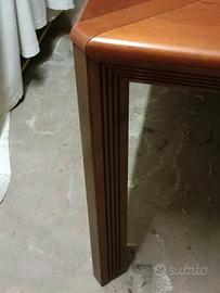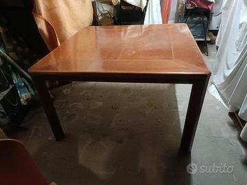 Tavolo quadrato anni '80, cm 120 per lato, in legno massello in noce, con un motivo geometrico sul ripiano, decoro tipico del design italiano dell'epoca per i mobili di alta qualità. le gambe sono angolari con un decoro di scanalatura verticale per tutta la lunghezza. In ottime condizioni, si trova al piano terreno a Firenze. Richiede un mezzo adeguato per il trasporto, a cura dell'acquirente.