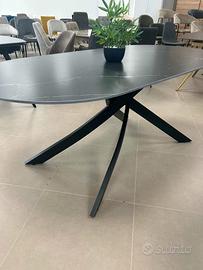 Tavolo ovale fisso con top in ceramica finitura marmo nero creta o bianco calacatta lucido. 11 mm. Base in metallo bianco verniciato a polvere.