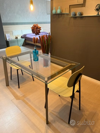 Tavolo fisso con piano in vetro. Struttura in metallo verniciato finitura titanio.