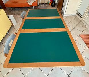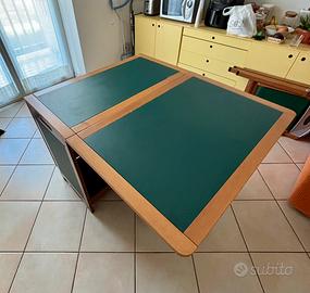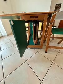 Tavolo Foppapedretti, modello Copernico, colore verde petrolio e legno noce, con sei sedie pieghevoli. Forma del piano del tavolo: Forma rettangolare, Tipo: Tavolo allungabile, Colore del piano scrivania: verde petrolio e legno noce. Lunghezza: 46 cm chiuso; 107 cm con una sola anta aperta; 168 cm con due ante aperte; Larghezza: 91 cm; Altezza: 74 cm. Il tavolo pieghevole Copernico di Foppapedretti ha una solida struttura in legno massiccio di faggio verniciato noce, con robusti piani apribili secondo le esigenze e piedini in nylon. Quando è chiuso, diventa una pratica consolle con maniglia per il trasporto, facilitato da ruote a apribili a scatto. Da chiuso può anche contenere 6 sedie Luna come da fotografia. I punti di forza di Copernico di Foppapedretti sono: - il tavolo ha piani pieghevoli che si aprono in base alle esigenze e al numero di ospiti - struttura solida in legno massiccio di faggio - possibilità di contenere 6 sedie Luna- quando è chiuso è un ottimo piano d'appoggio e occupa pochissimo spazio - facile da trasportare grazie alle ruote a scomparsa antigraffio apribili a scatto